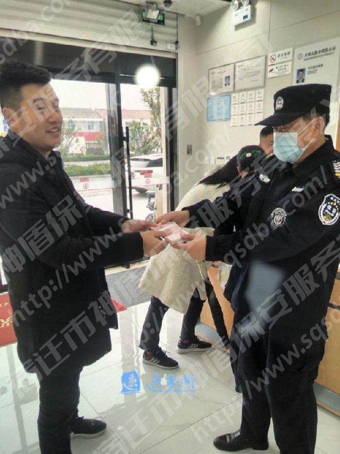 (速新聞?dòng)浾?/span>  孫軍賢   通訊員  李霄 如果在路邊撿到萬元現(xiàn)金,你會(huì)怎么做?1126日上午,記者從宿遷市神盾保安服務(wù)有限公司獲悉,該公司保安劉秀林在路邊撿到2萬元現(xiàn)金后,沒有絲毫遲疑便將現(xiàn)金交到銀行,后查找核實(shí)后及時(shí)歸還失主。