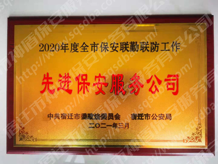 宿遷市神盾保安服務(wù)有限公司被中共宿遷市委政法委員會、宿遷市公安局評為2020年度全市保安聯(lián)勤聯(lián)防工作先進保安服務(wù)公司