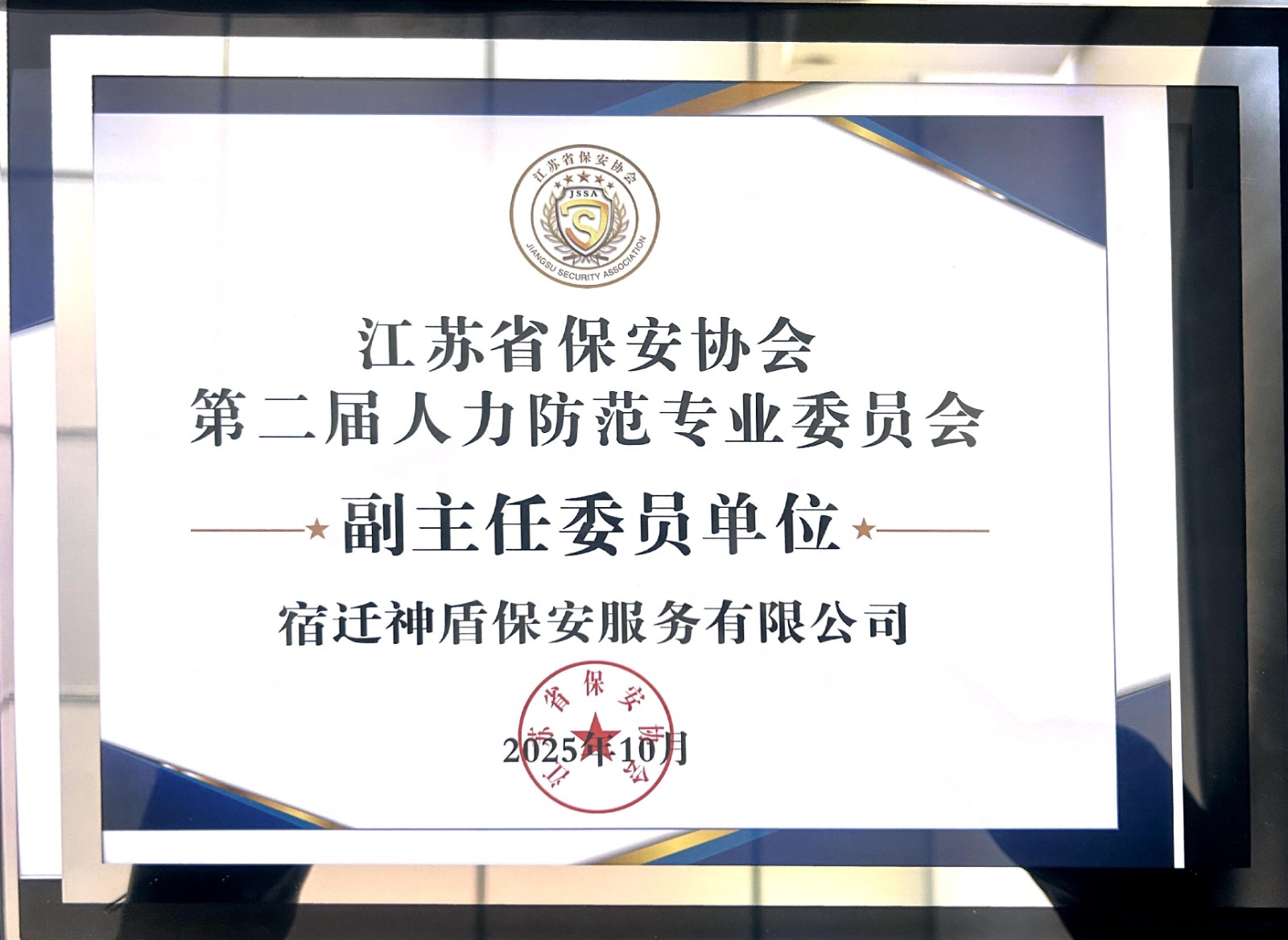 2025年10月16日,在江蘇省保安協(xié)會(huì)于徐州召開的換屆會(huì)議上,宿遷市神盾保安服務(wù)有限公司成功當(dāng)選為副主任委員單位,全省僅四家單位獲此資格,標(biāo)志著公司行業(yè)地位與專業(yè)能力獲得廣泛認(rèn)可。